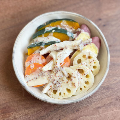 福神漬によく合う料理として、無水チキンカレーと副菜、スープもご紹介します。無水カレーはカレールーを使った簡単なレシピとなっていますが、スパイシーで本格的な味わいです。燻製の会やトマトの会などのスペシャルイベントでお子様用のランチとして提供させていただいているものですが、「このレシピが知りたい!」とおっしゃる方も多かったので、このレッスンに加えさせていただきました。野菜の旨みたっぷりの濃厚で深い味わいのカレーとなっています。