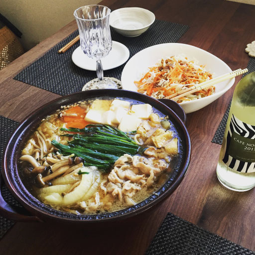 味噌作りのあとは、みんなでランチ。味噌ちゃんこと、味噌ドレッシングのキャベツサラダをご用意しました。頑張ったご褒美にワインも♪ さらにおしゃべりにも花が咲き、とても楽しいひとときでした。