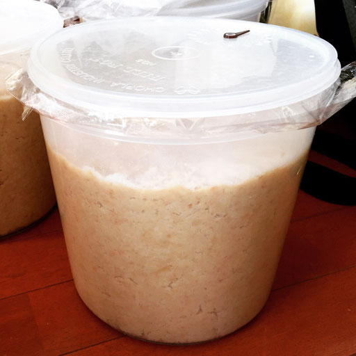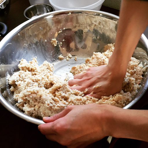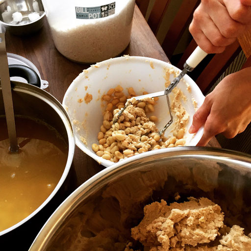 茹でた大豆をつぶして、塩切り麹と混ぜて、味噌団子を作って、容器に詰めたら、終わり。あとは半年から一年寝かせます。決して難しい作業ではないけれど、時間も体力もいるので、一人でやるとなると億劫だし、寂しい。でも、みんなでワイワイ作ると、楽しくてあっという間なのです。