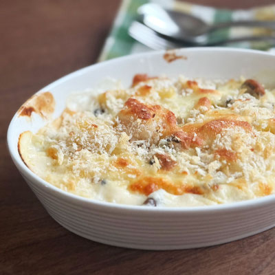 続いて、外はこんがり、中はとろーりのエビマカロニグラタン。ホワイトソースを作るのは難しいと思っているかもしれませんが、ダマなし失敗知らずの作り方をご紹介します。これを覚えれば、ドリアやシチューなどにも応用可能。市販のレトルトやルーが要らなくなりますよ。