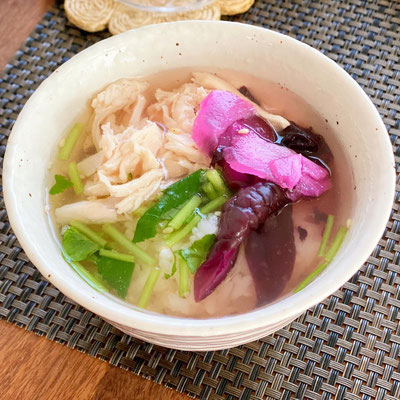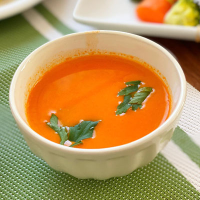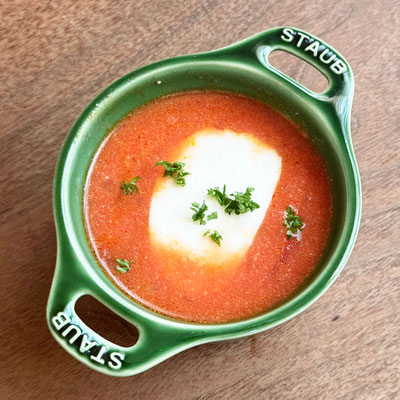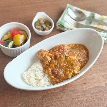 福神漬によく合う料理として、無水チキンカレーと副菜、スープもご紹介します。無水カレーはカレールーを使った簡単なレシピとなっていますが、スパイシーで本格的な味わいです。燻製の会やトマトの会などのスペシャルイベントでお子様用のランチとして提供させていただいているものですが、「このレシピが知りたい!」とおっしゃる方も多かったので、このレッスンに加えさせていただきました。野菜の旨みたっぷりの濃厚で深い味わいのカレーとなっています。
